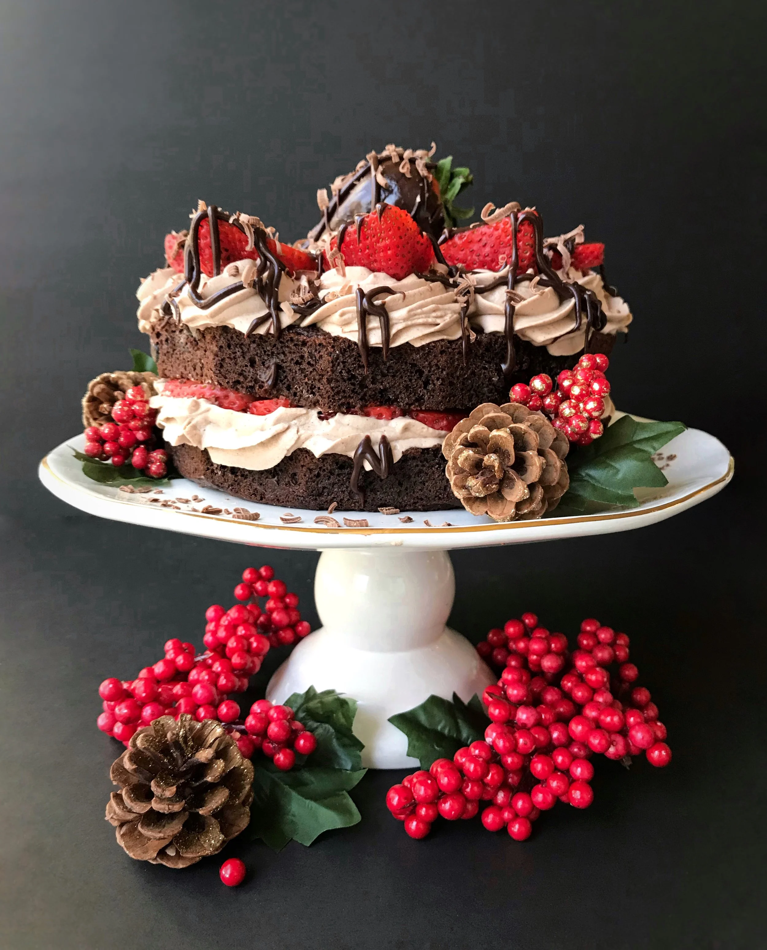 Layers of moist chocolate cake, speckled with bites of chocolate chips, sandwich a velvety layer of creamy mousse, and fresh, sweet strawberries drizzled with rich ganache. The filling is repeated on top and finished off with a sprinkle of chocolate shavings, which can easily be made by grating a chocolate bar.
