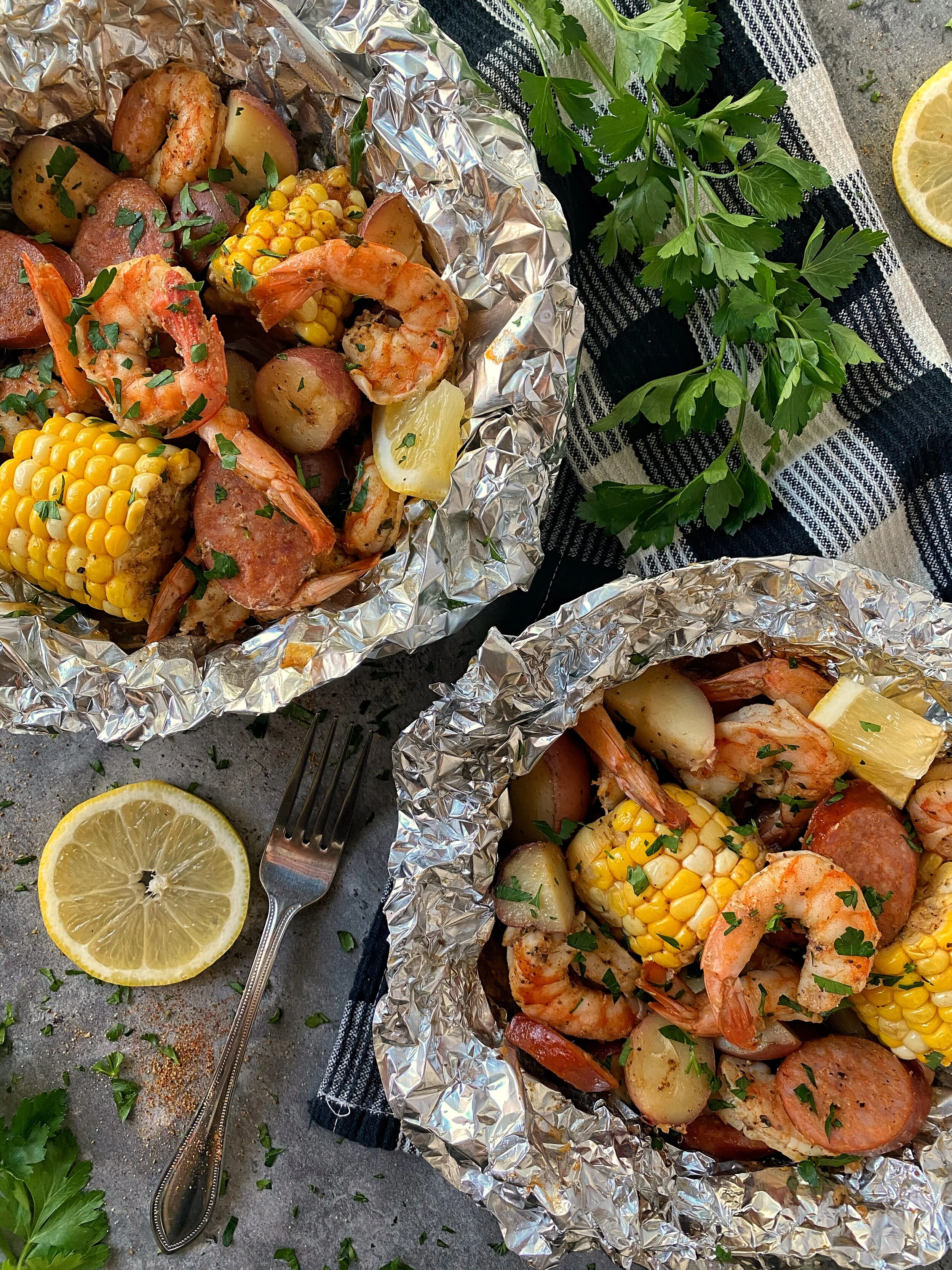 Easy and fun, these shrimp foil packets will become your favorite summer meal. Loaded with succulent shrimp, juicy sausage, sweet corn and tender baby potatoes in a flavorful Cajun broth, it’s basically a shrimp boil made in convenient individual packets.